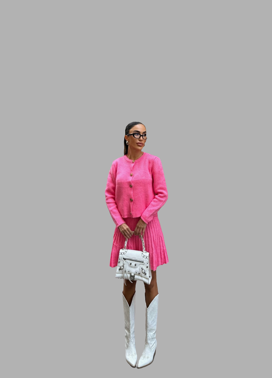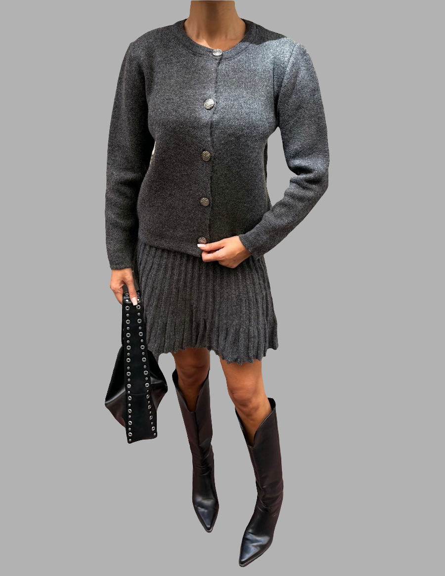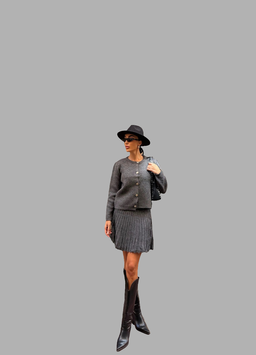 🌸 Bisiklet Yaka Hırka ve Pile Detaylı Etek Triko Takım 🌸