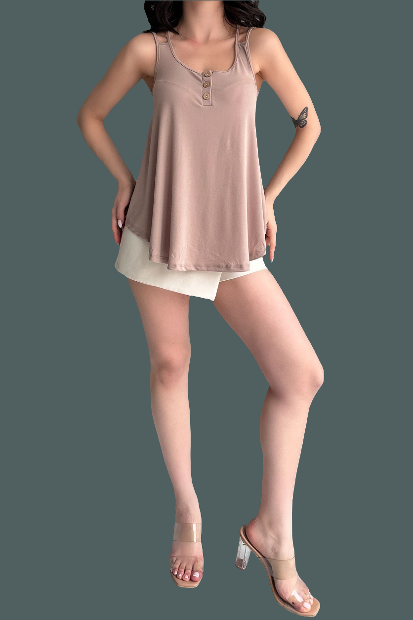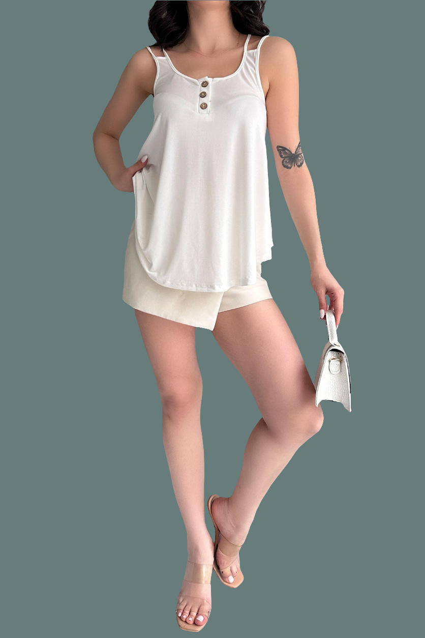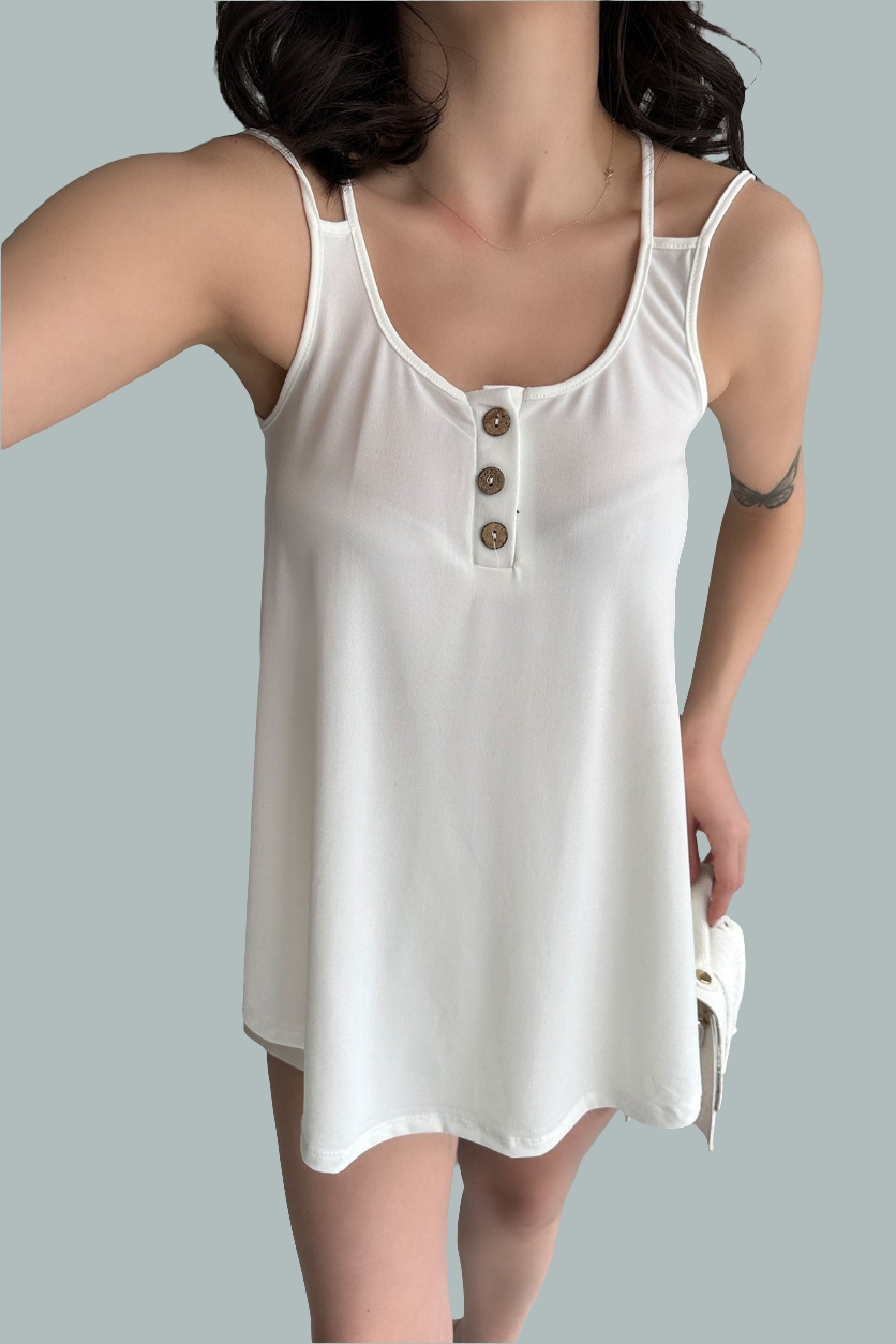Zarif ve sade şıklığın bir araya geldiği bu askılı bluz, gardırobunuzun kurtarıcı parçalarından biri olacak. Yumuşak dokusu ve dökümlü formuyla gün boyu konfor sağlarken, ön kısmındaki düğme detayları modern bir dokunuş katıyor.