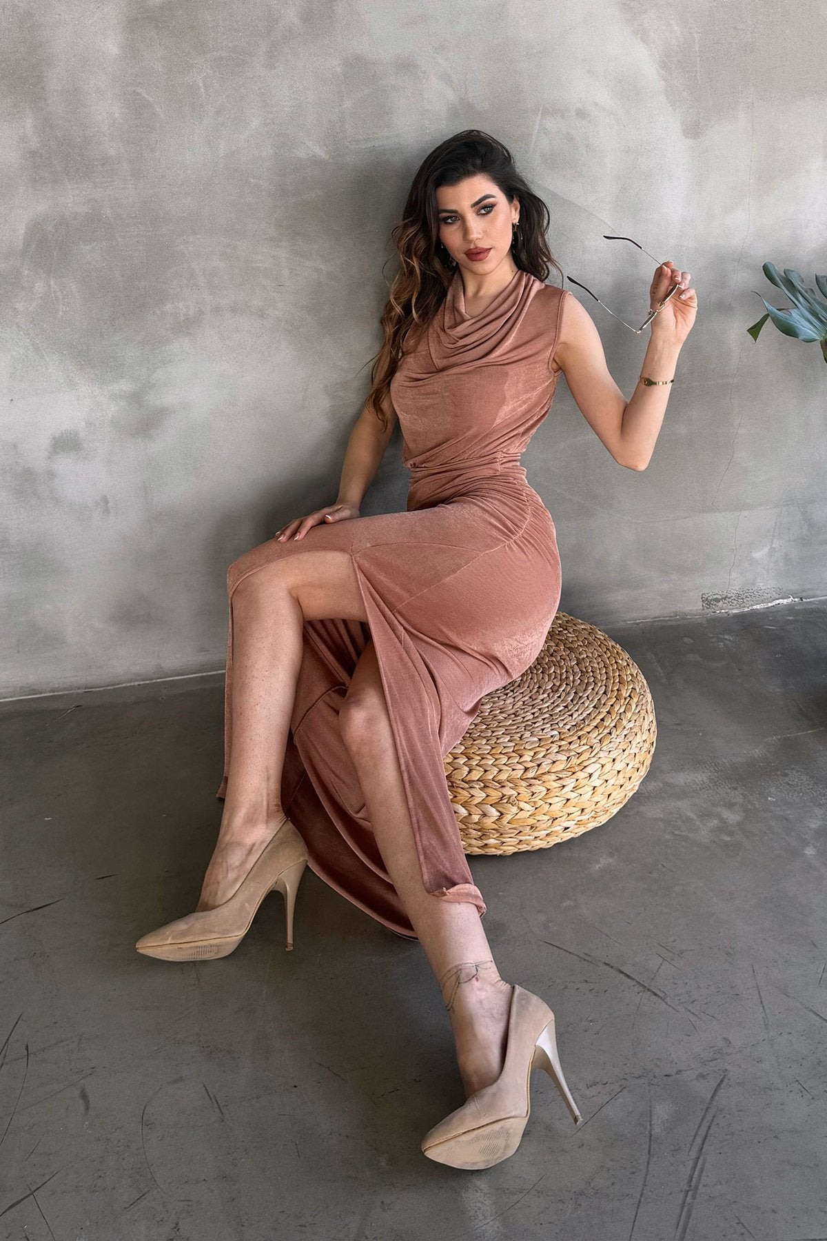 Pudra Renk Yırtmaçlı Drapeli Kadın Elbise – Zarif ve Şık Tasarım