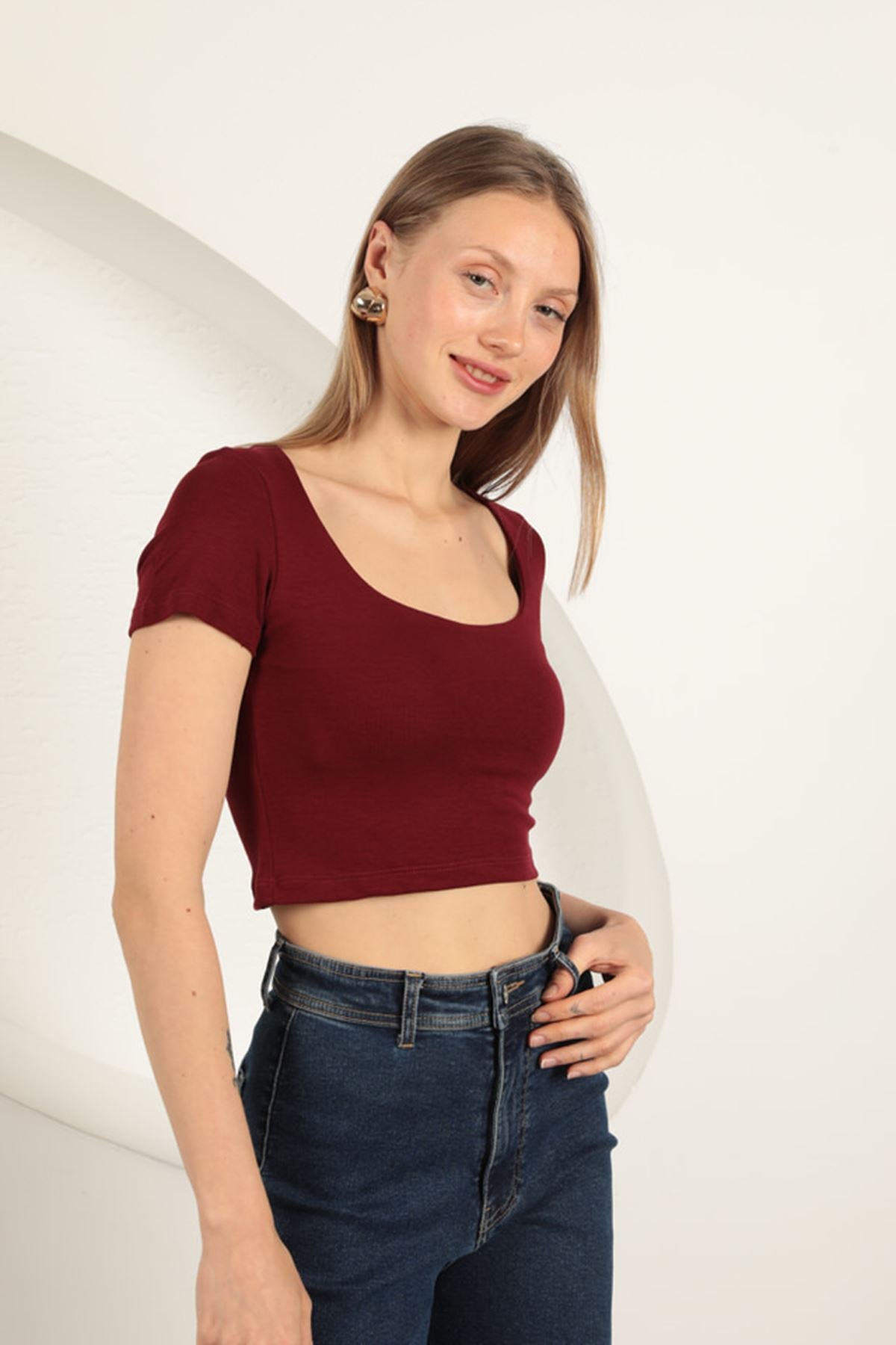 Çilek Viskon Kumaş U Yaka Bluz-Bordo