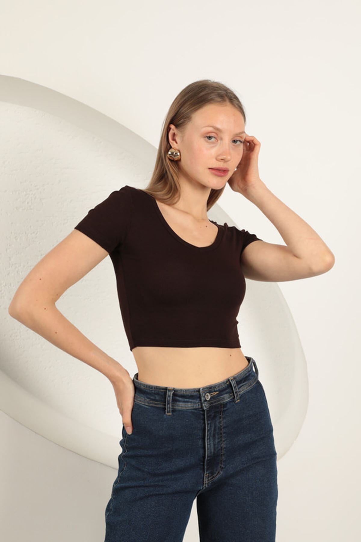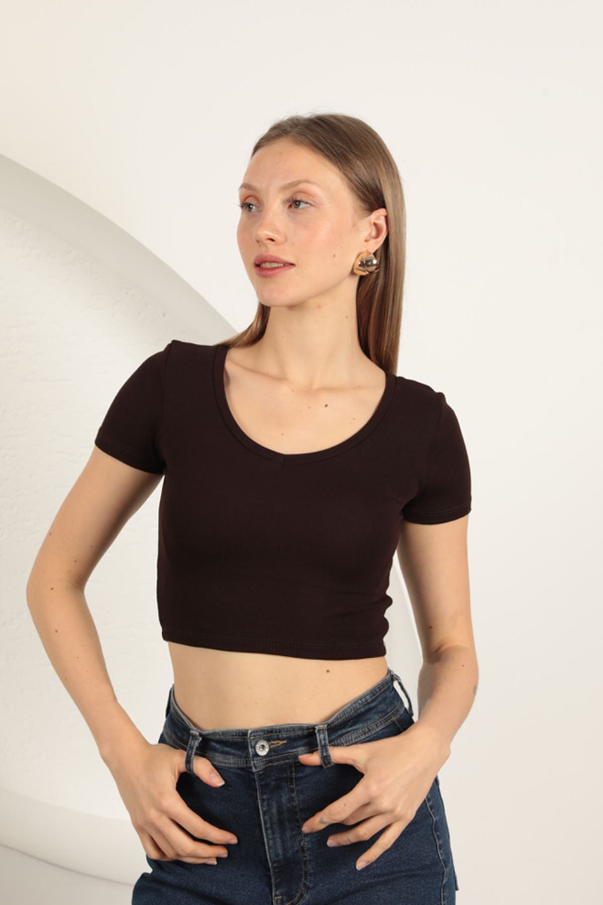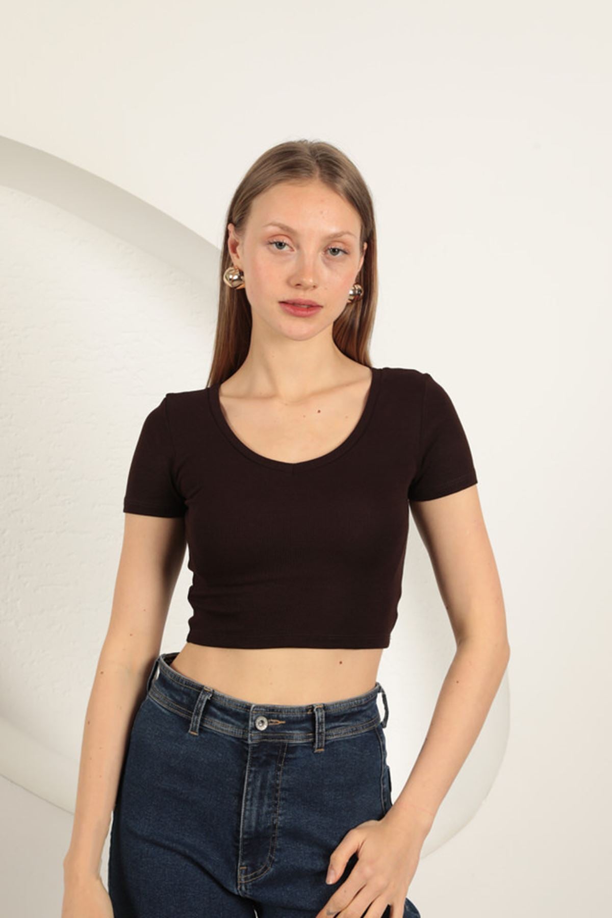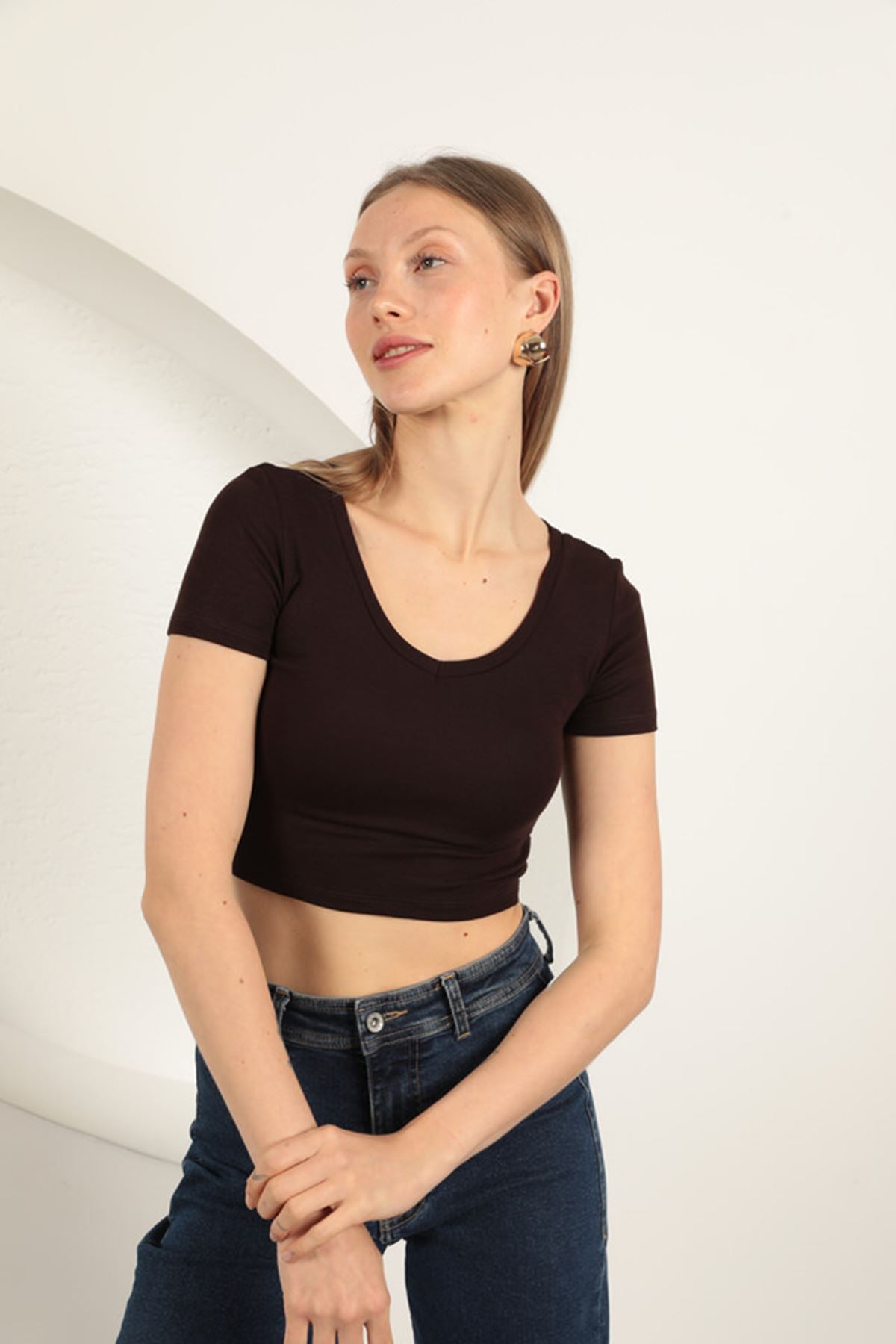 Çilek Viskon Kumaş V Yaka Basic Tişört-Kahve