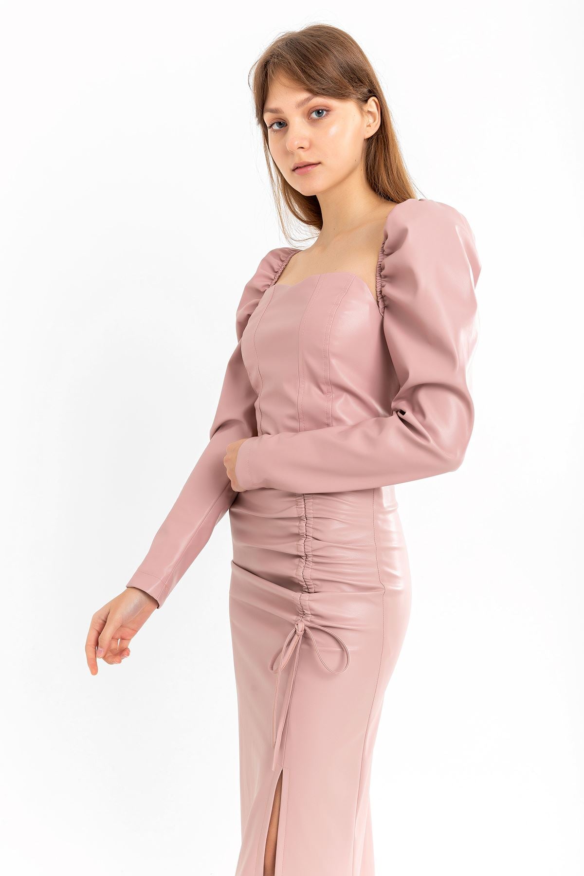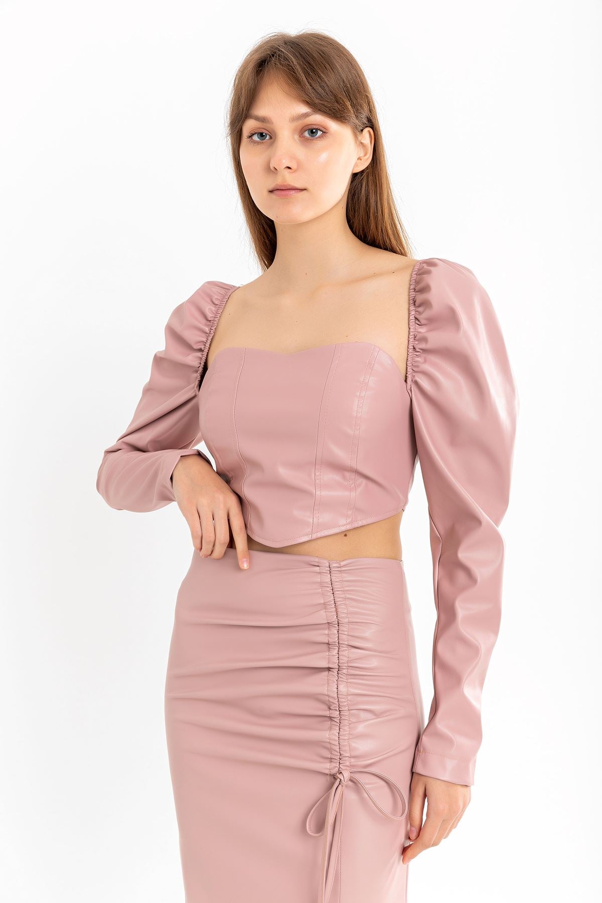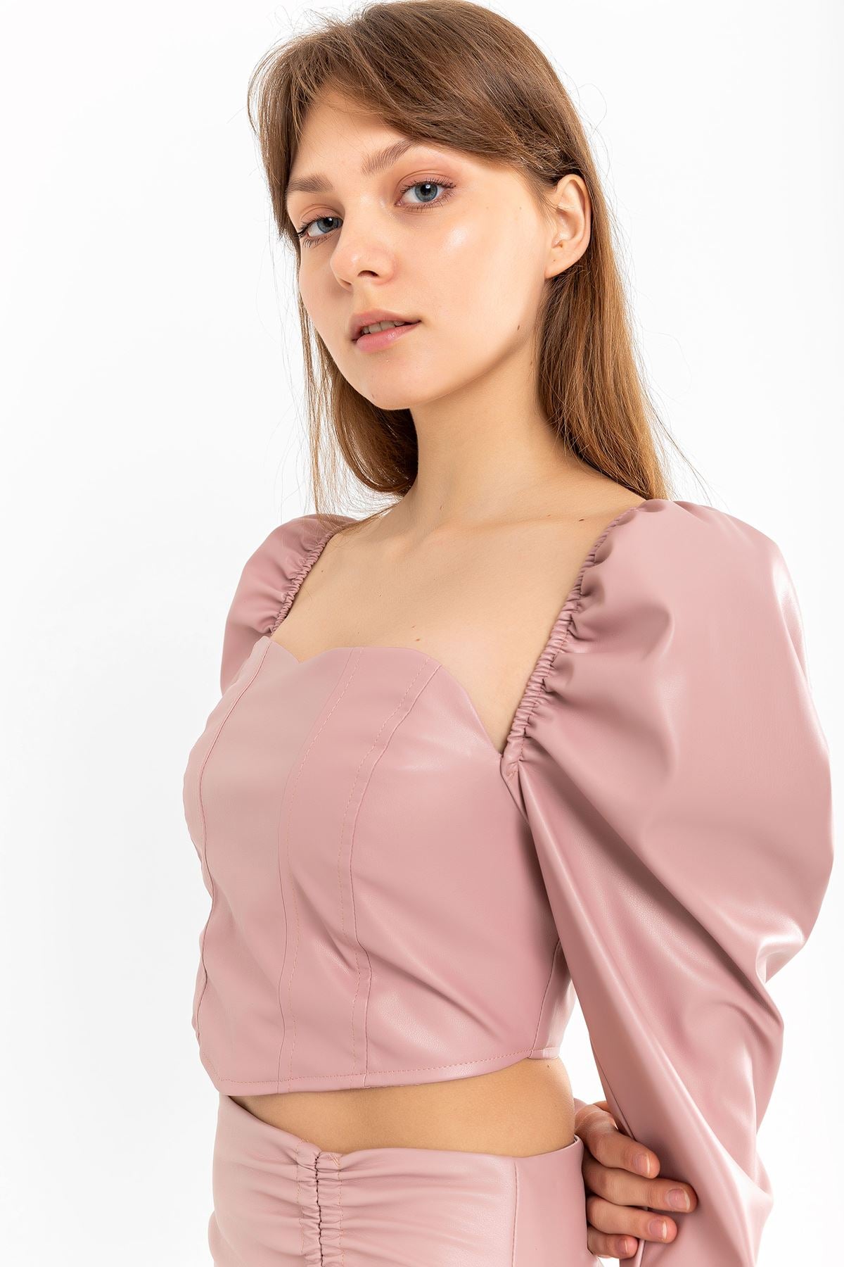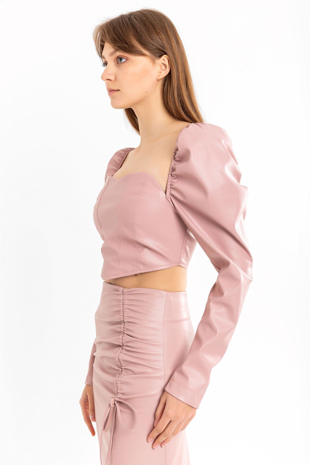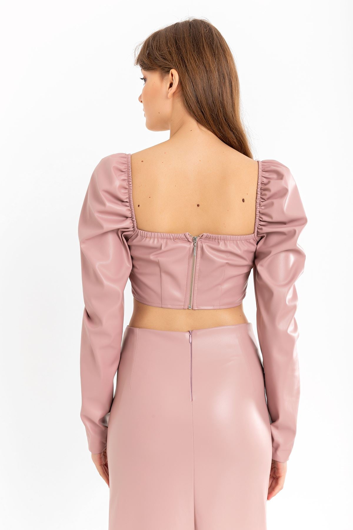 Deri Kumaş Straplez Kalp Yaka Fermuar Detaylı Kadın Crop-Pudra