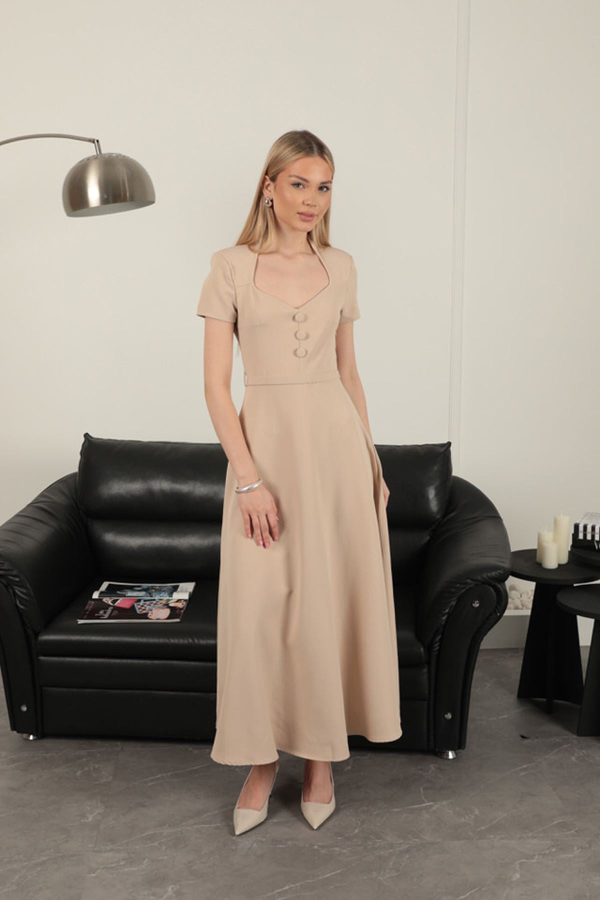 Double Atlas Kumaş Kemerli Elbise-Bej