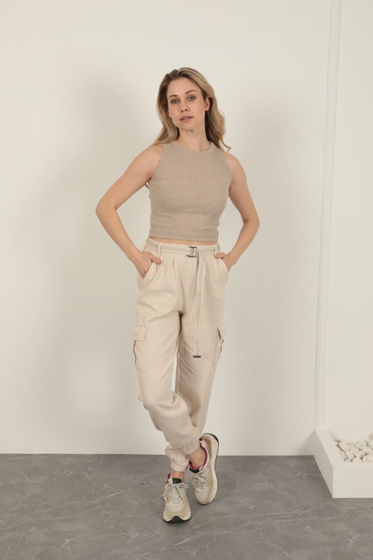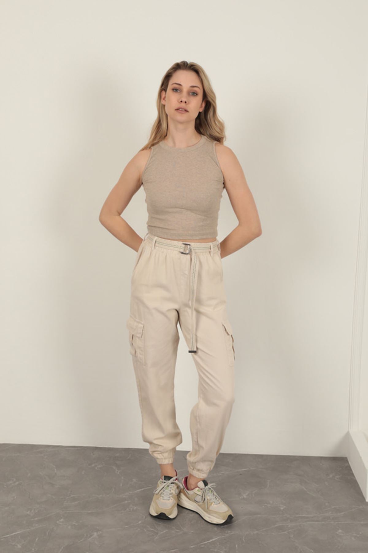Gabardin Kumaş Kemerli Kargo Kadın Pantolon-Bej