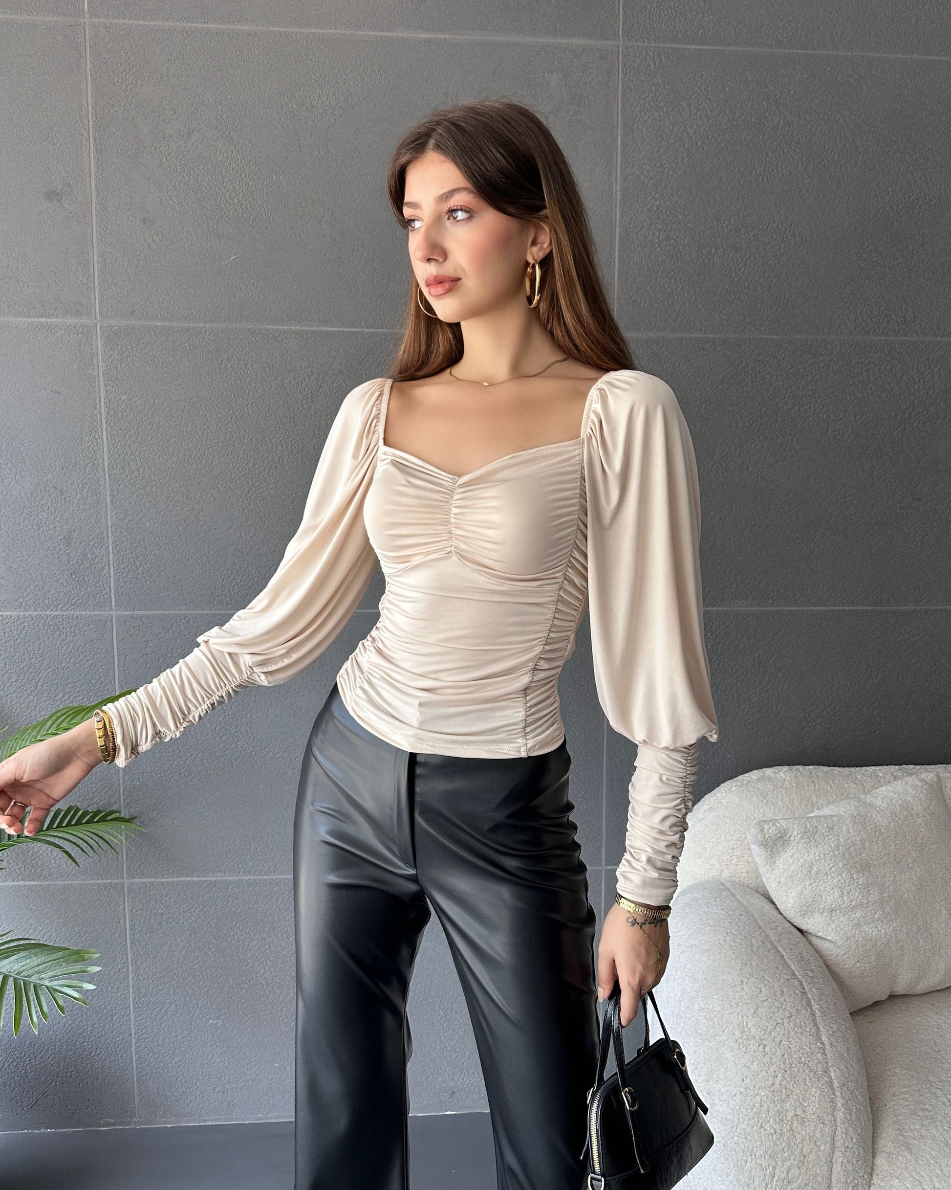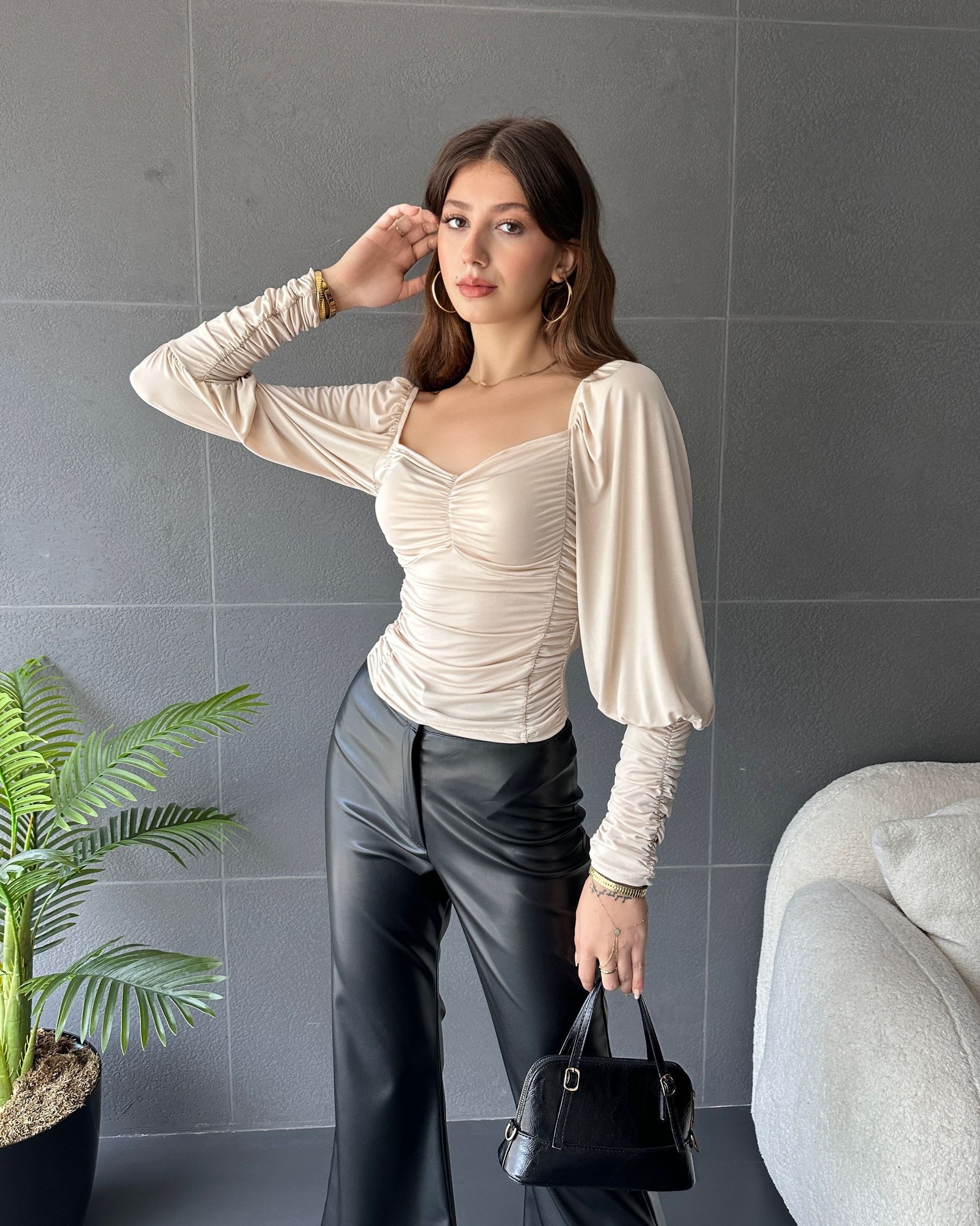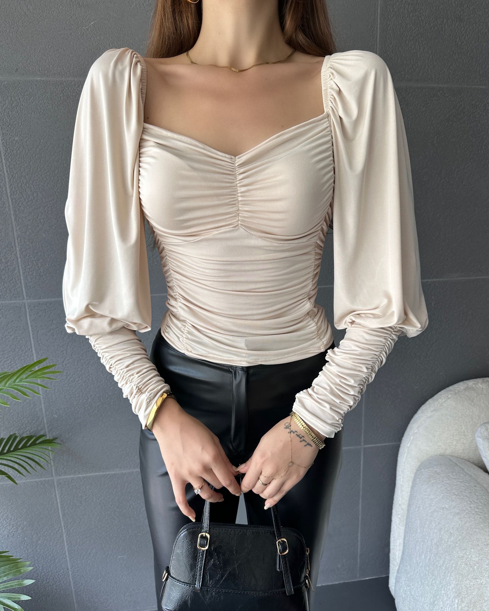 Kalp Yaka Önü Ve Manşeti Drapeli Bluz
