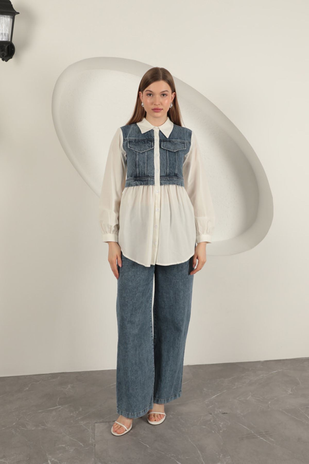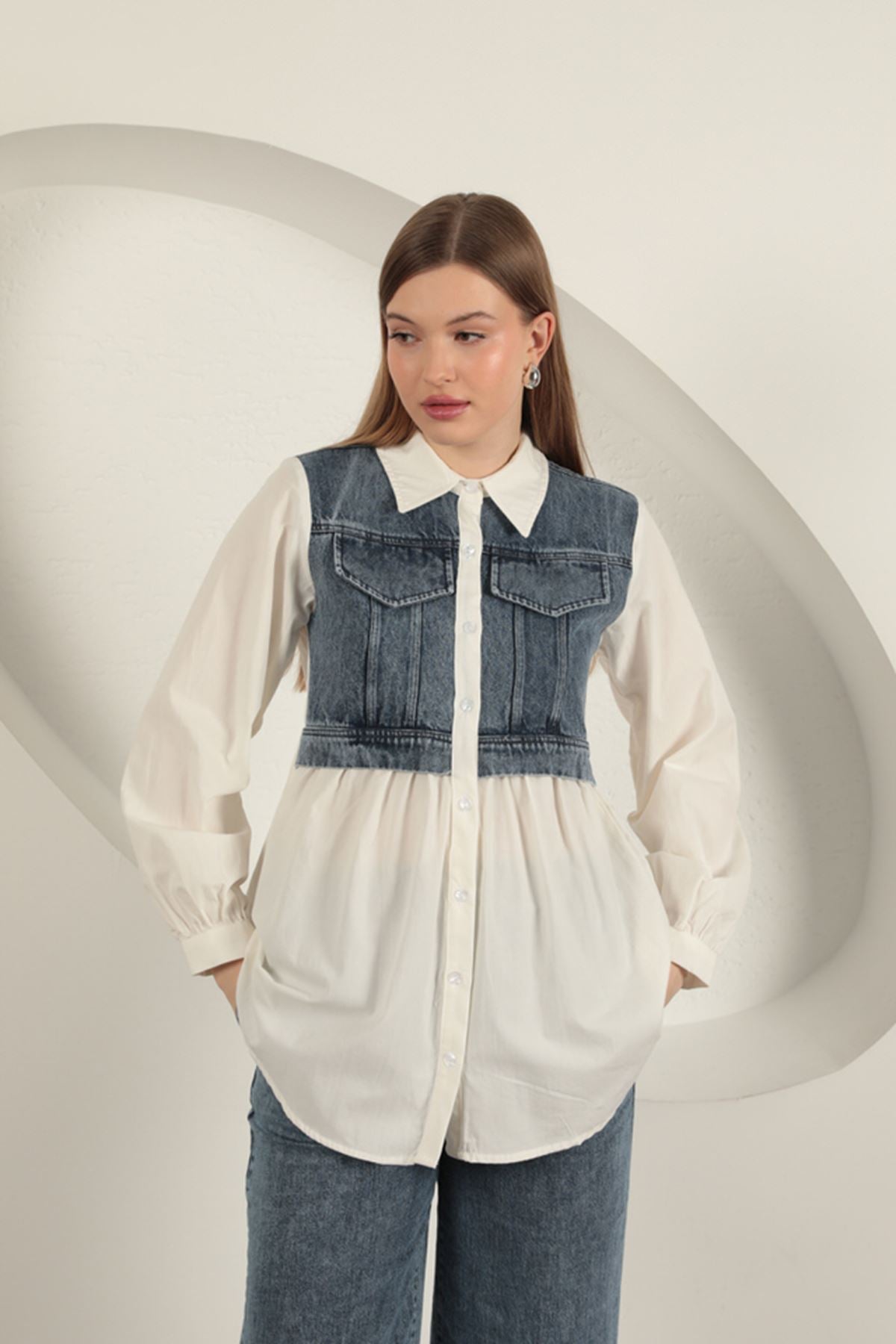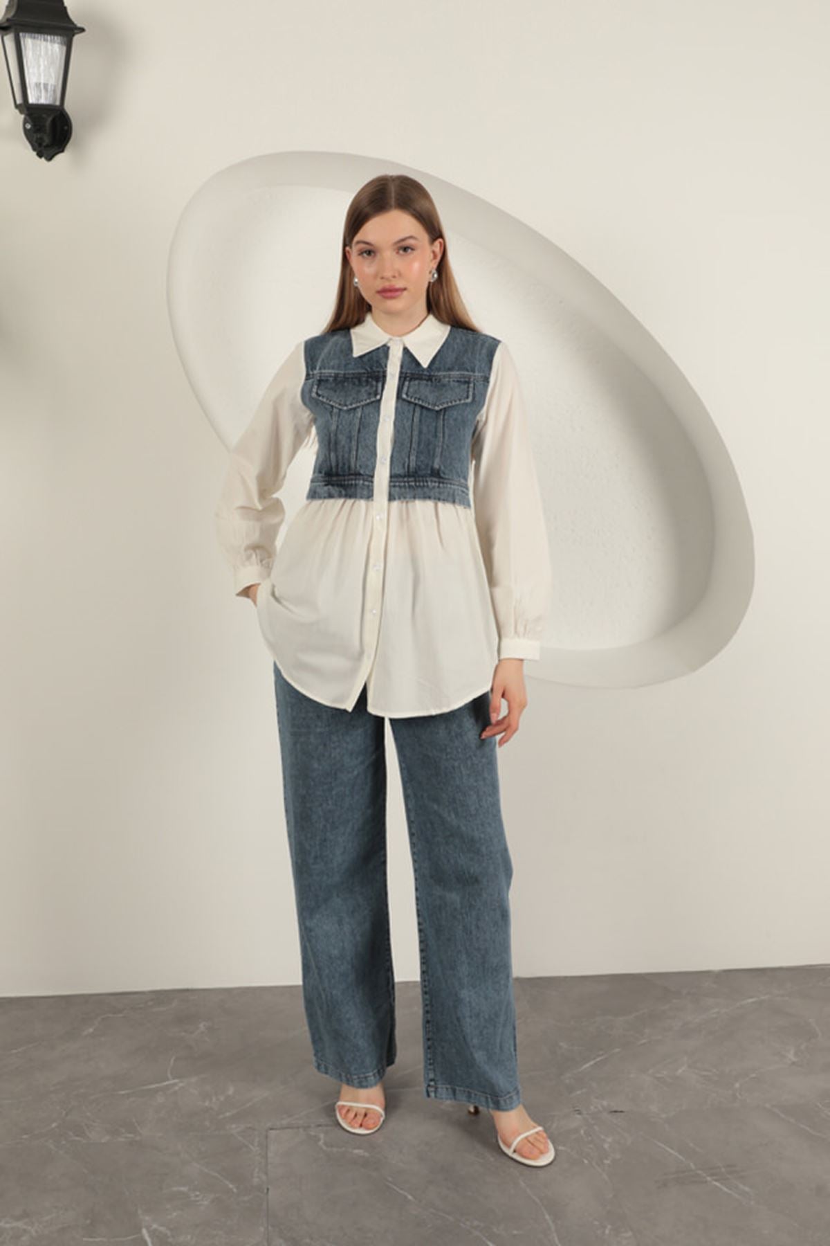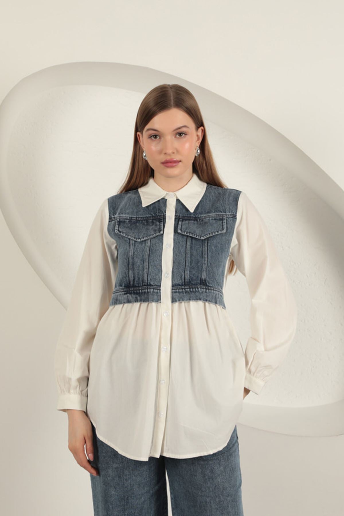 Poplin Kumaş Kot Garnili Ekru Kadın Gömlek