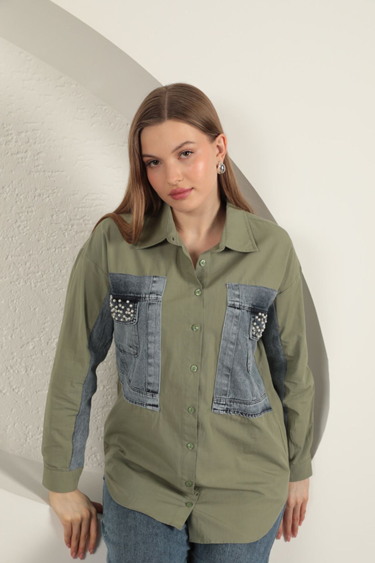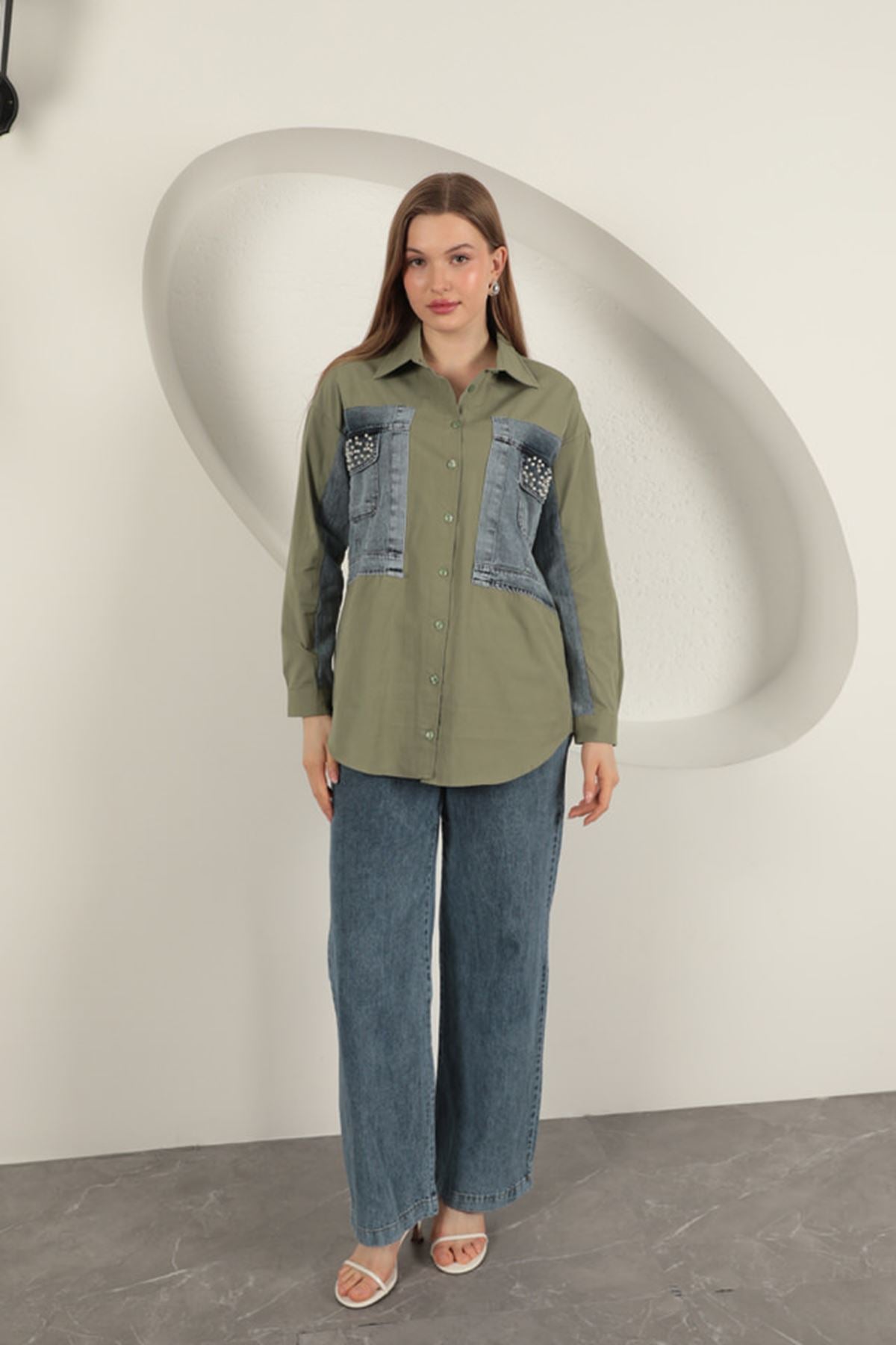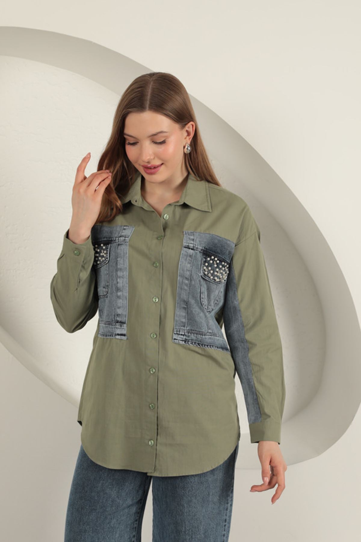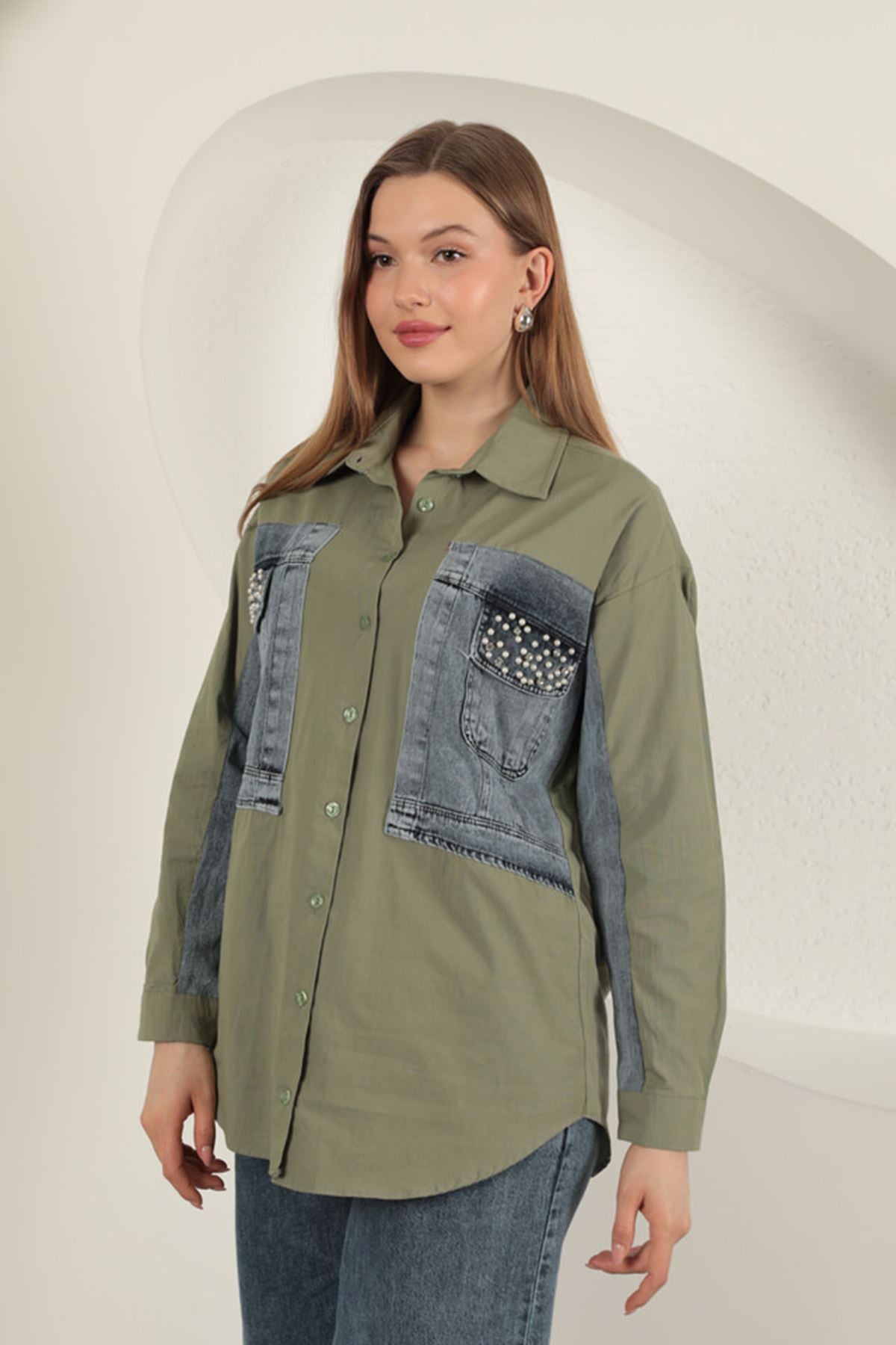 Poplin Kumaş Kot Garnili Haki Kadın Gömlek