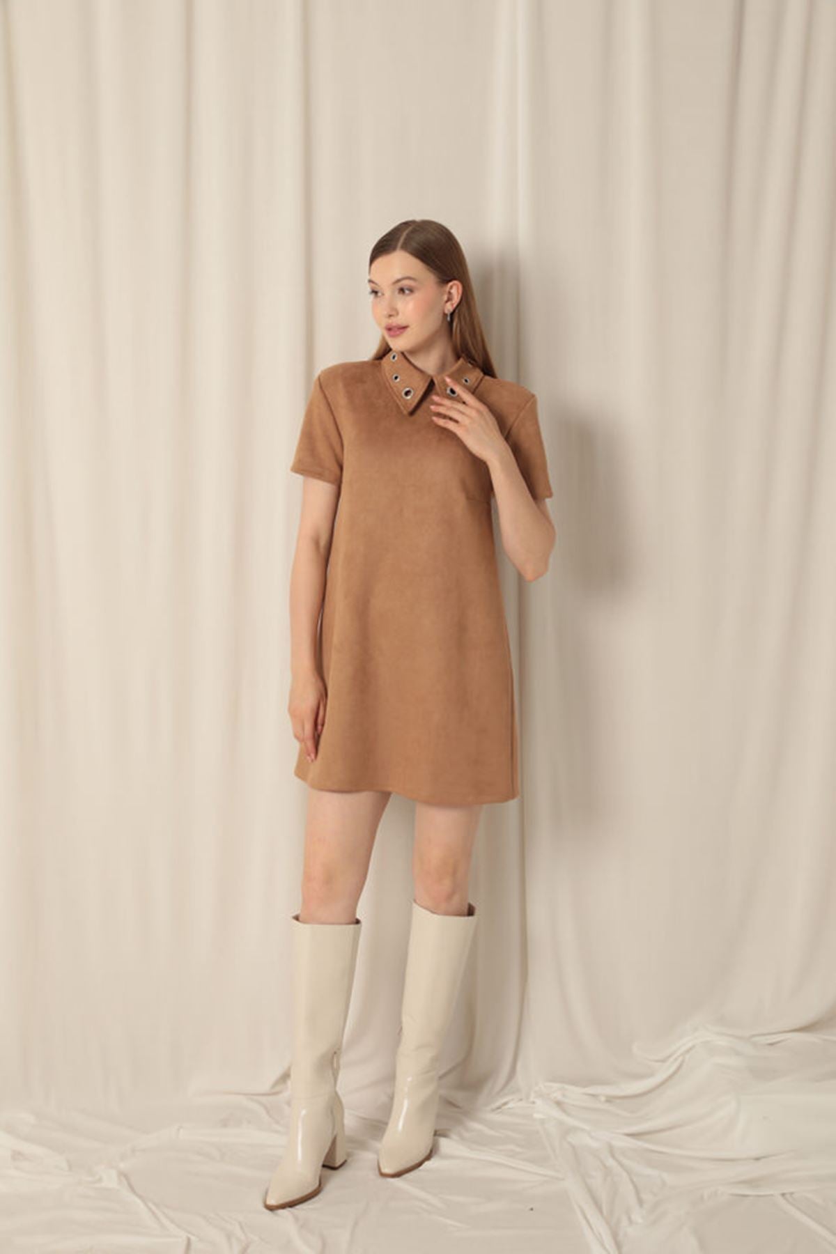 Süet Kumaş Kuş Gözlü Bej Elbise