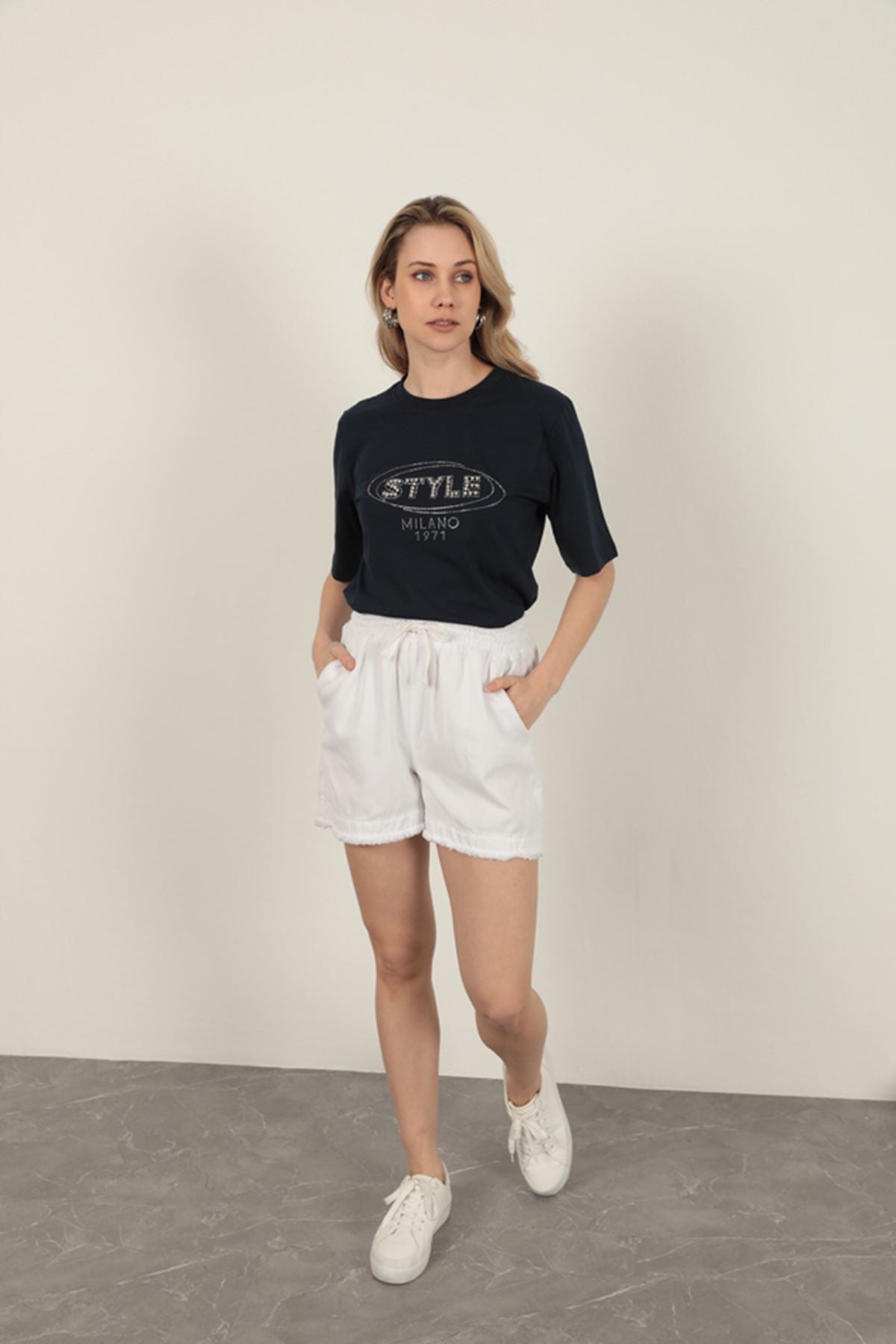 Süprem Kumaş Taş Detaylı Kadın Tişört-Lacivert