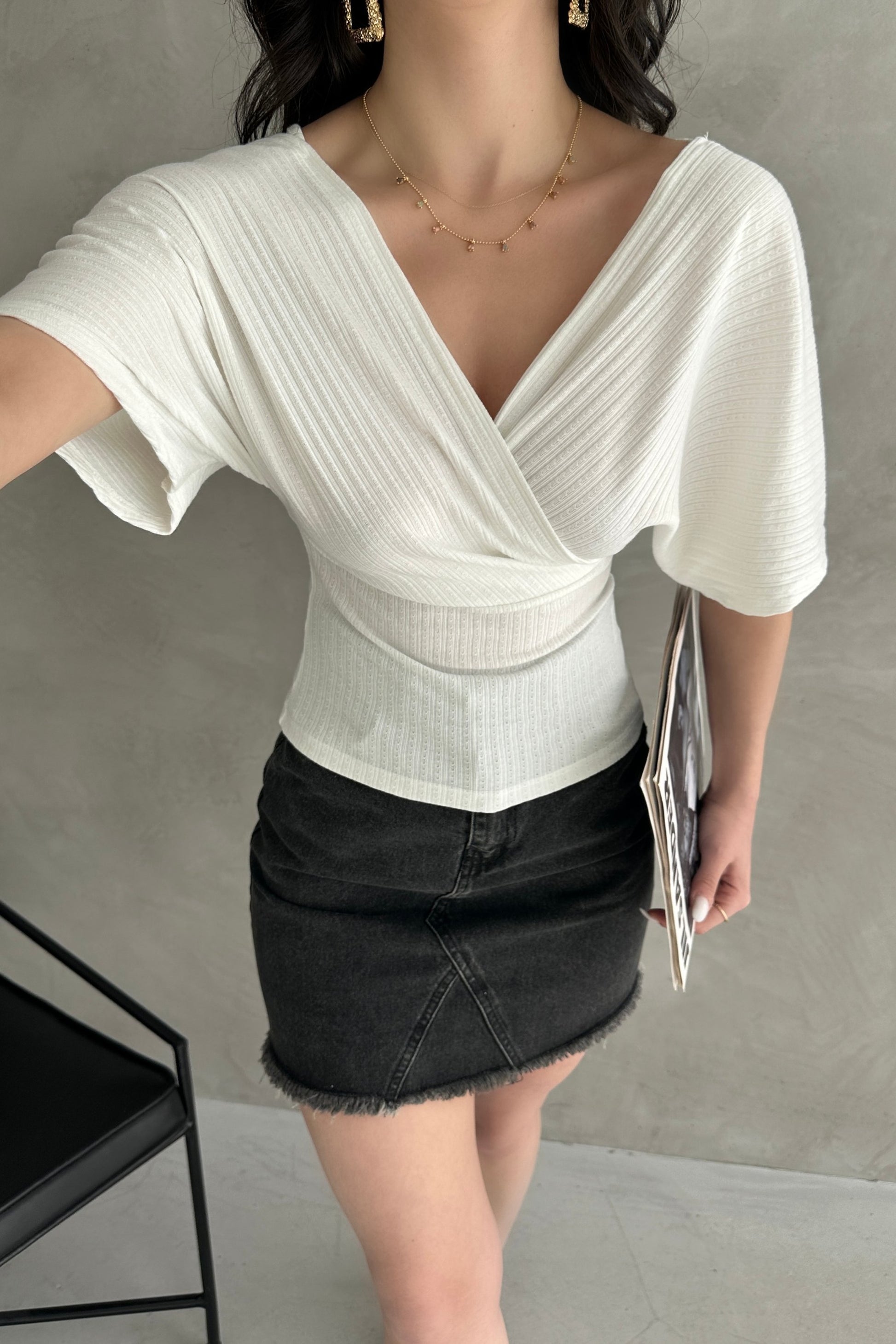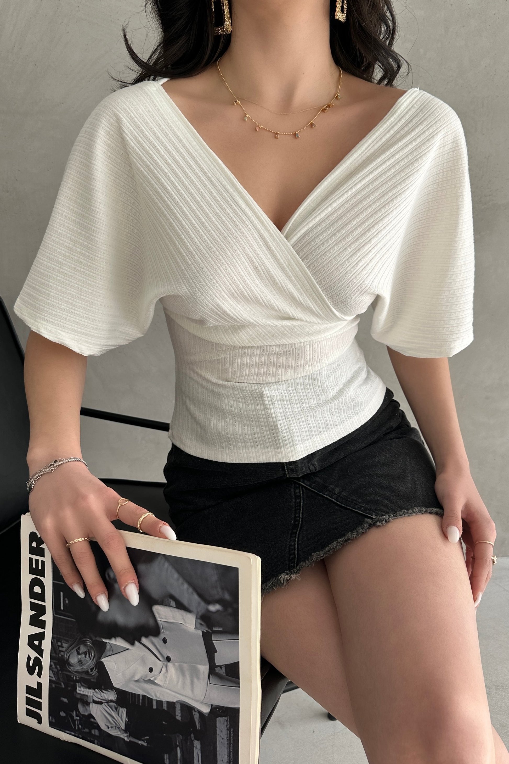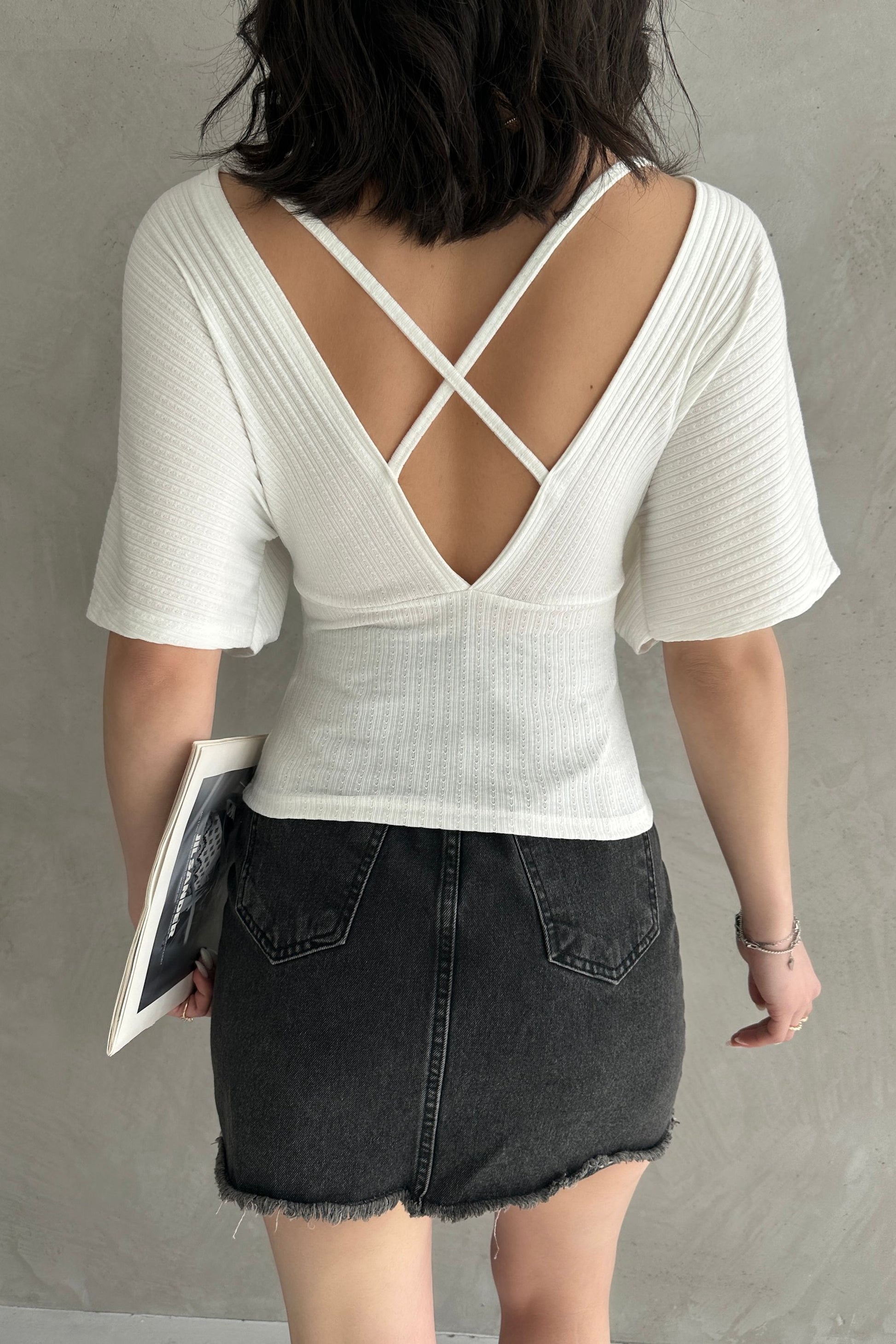 V Yaka Sırtı Çapraz Bantlı Fitilli Bluz