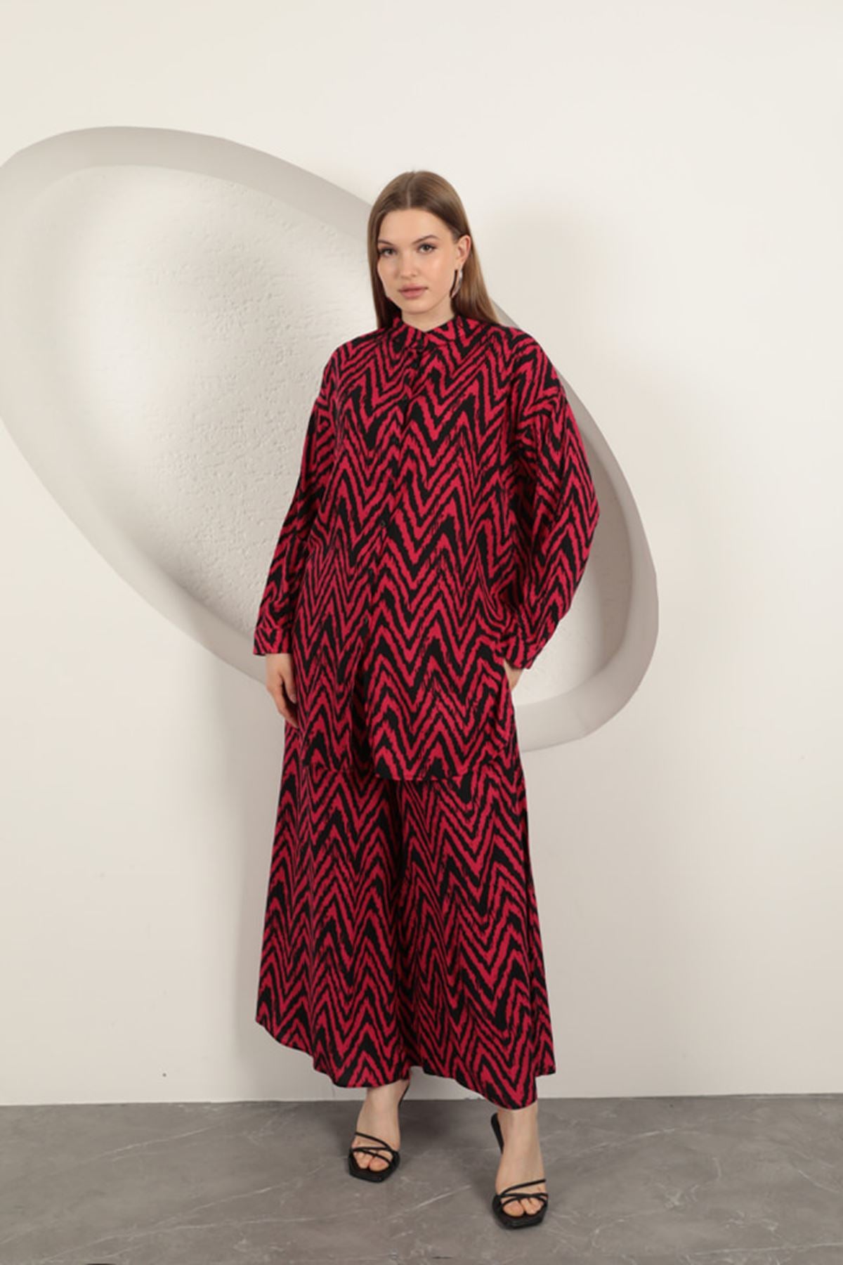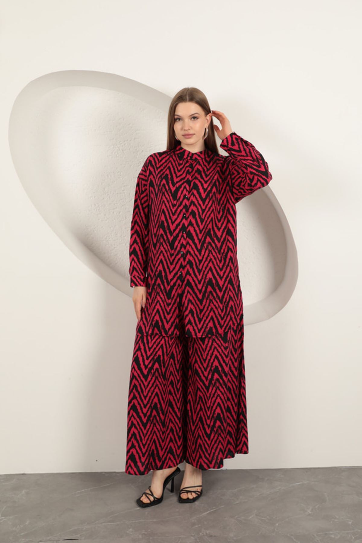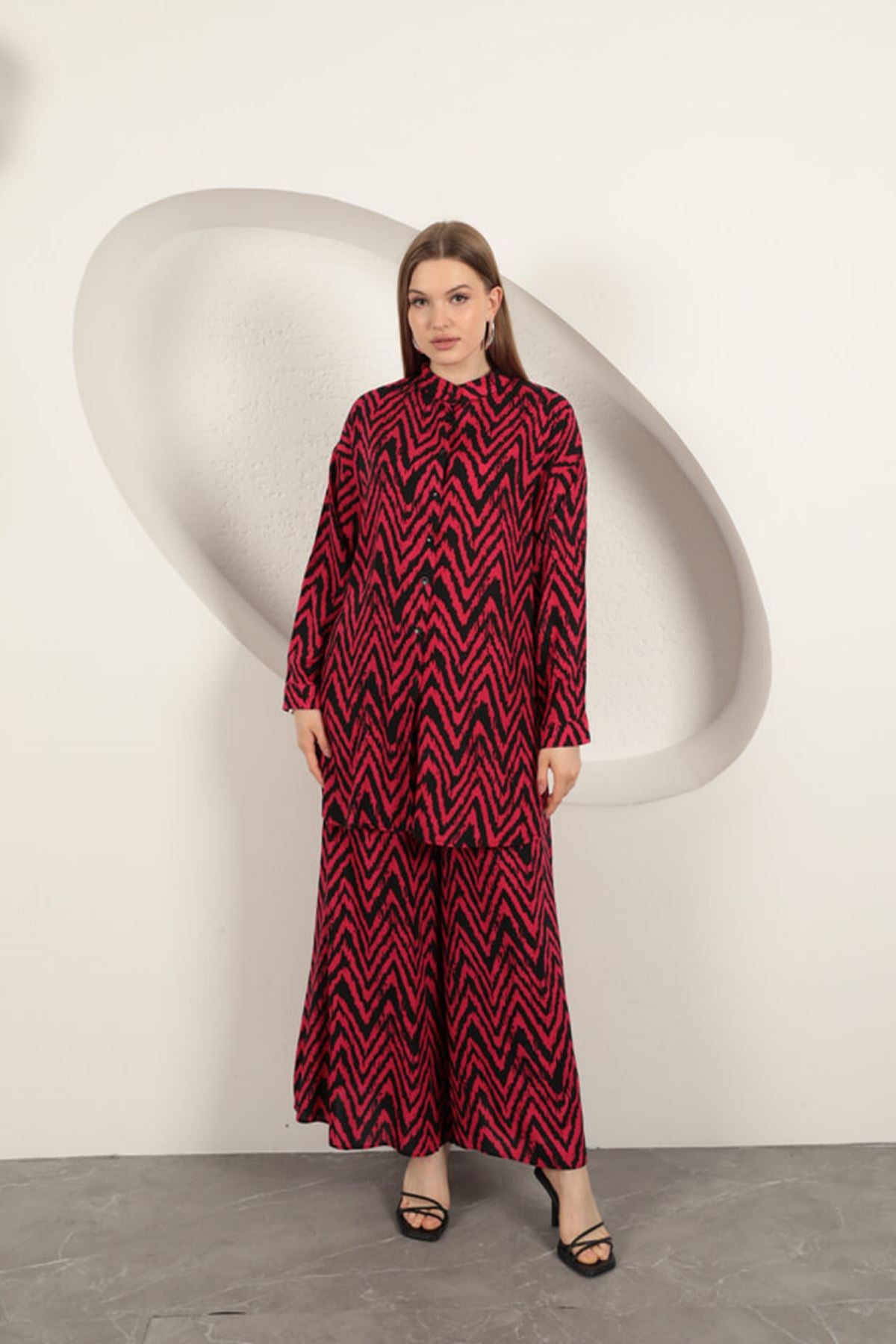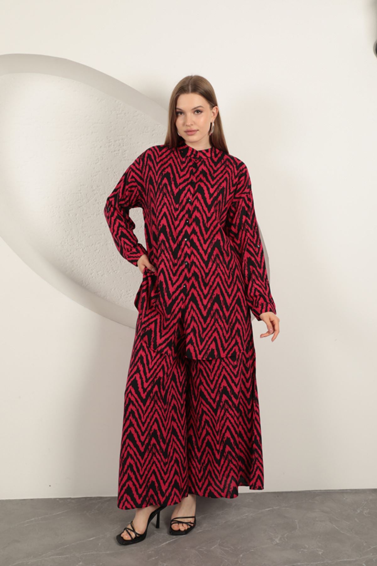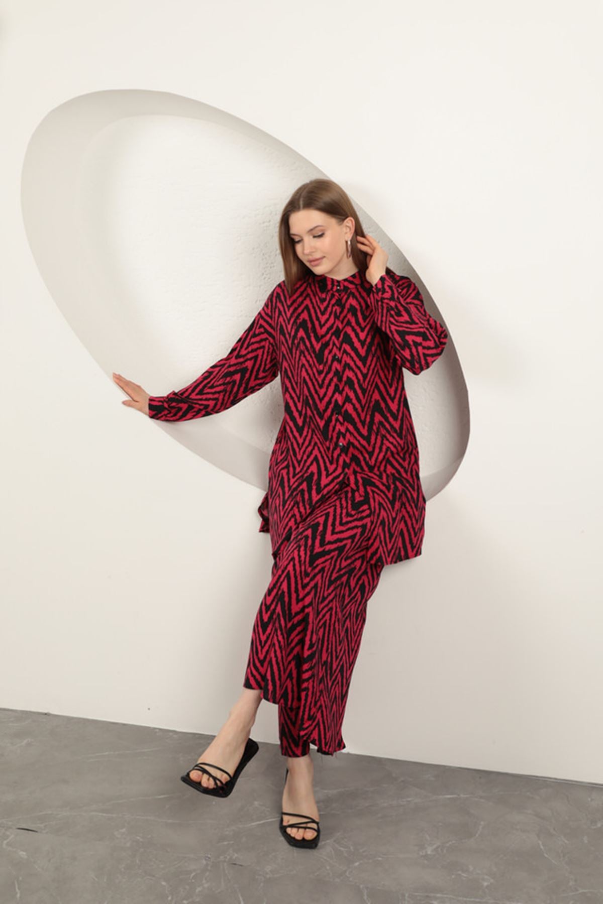 Viskon Kumaş Çizgili Kadın Takım-Fuşya