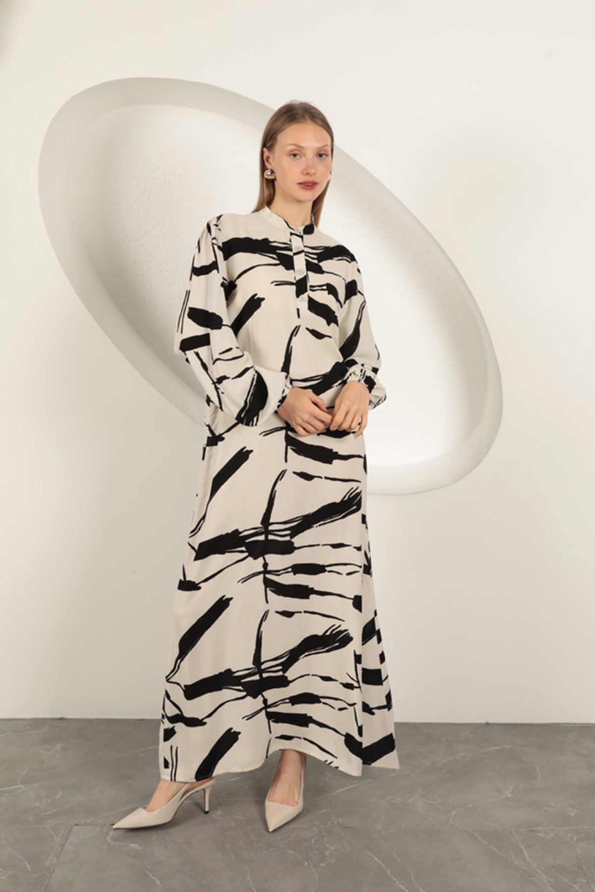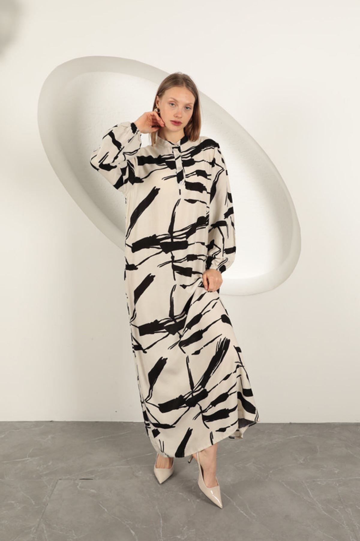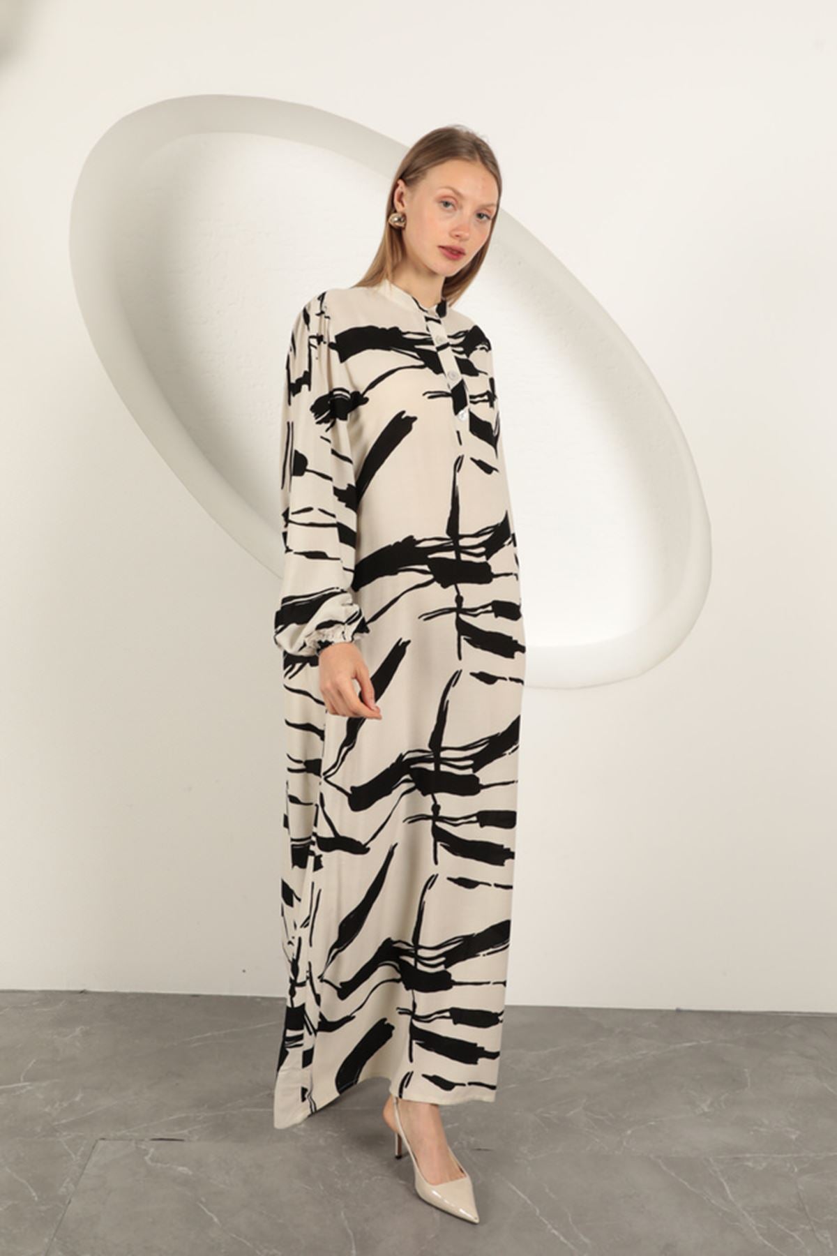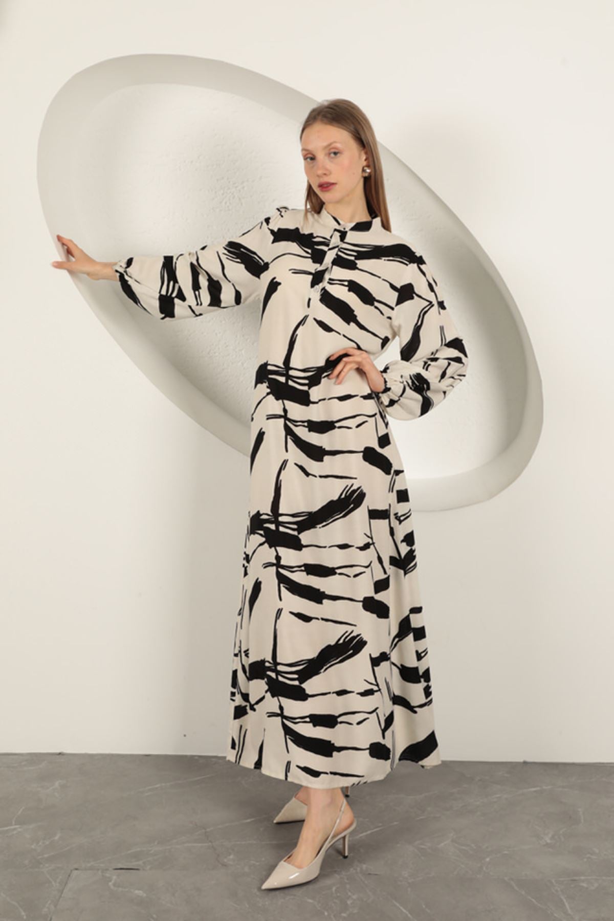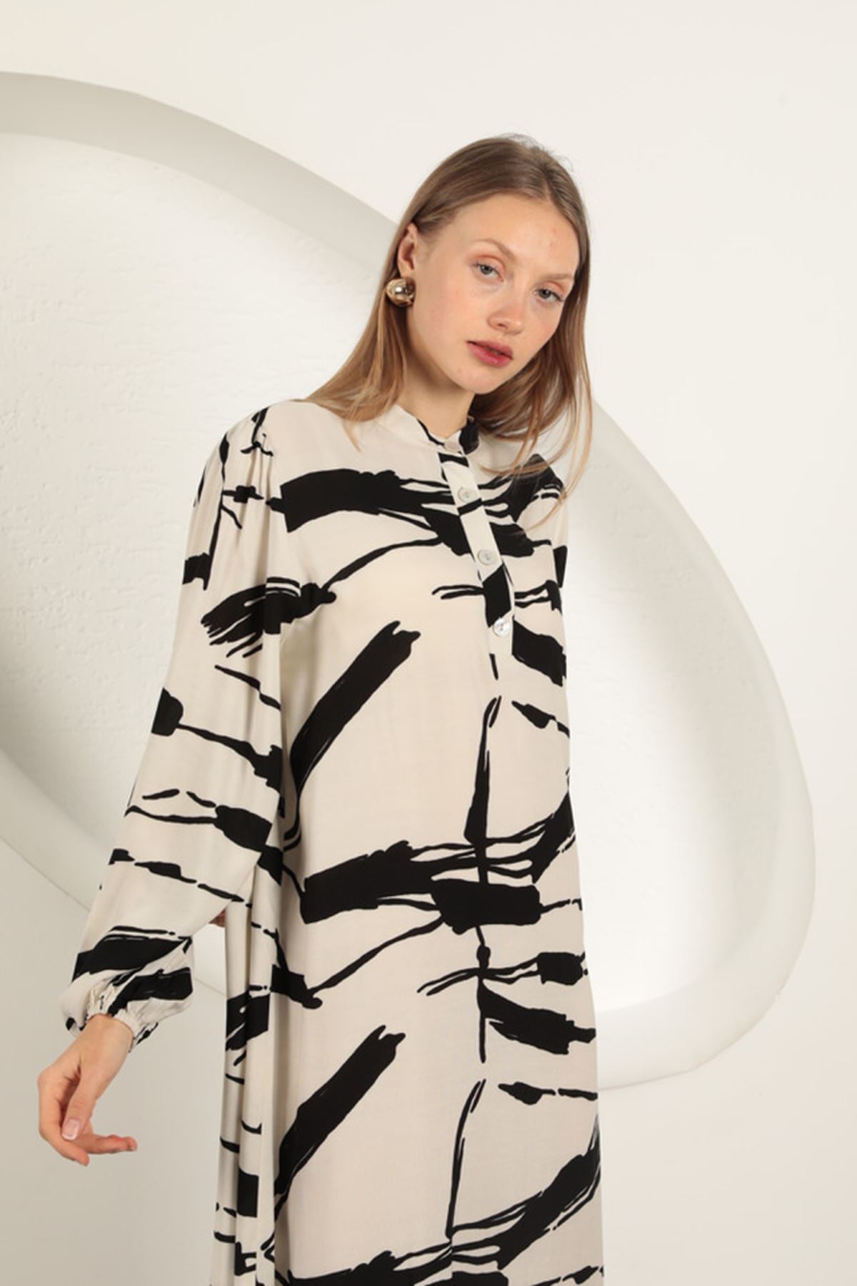 Viskon Kumaş Desenli Elbise-Ekru