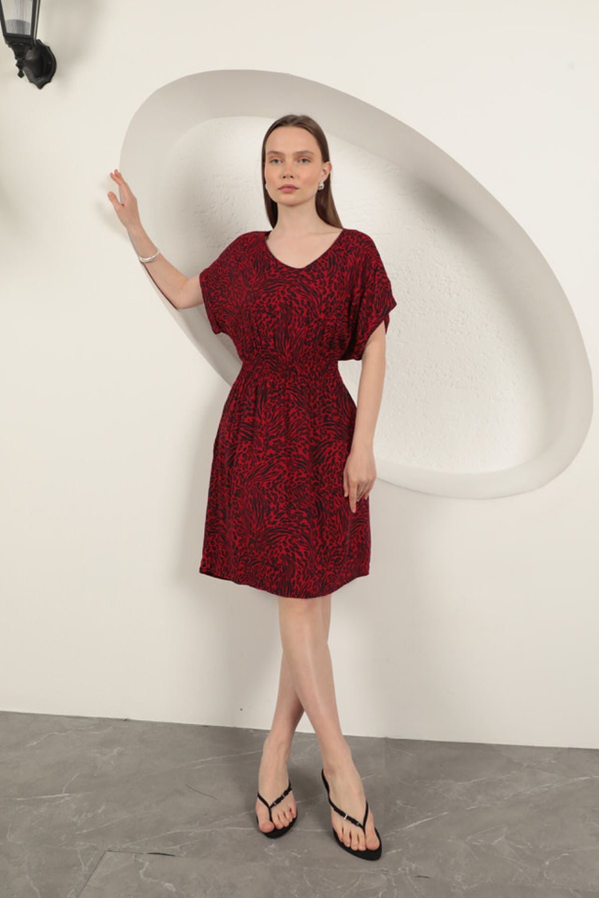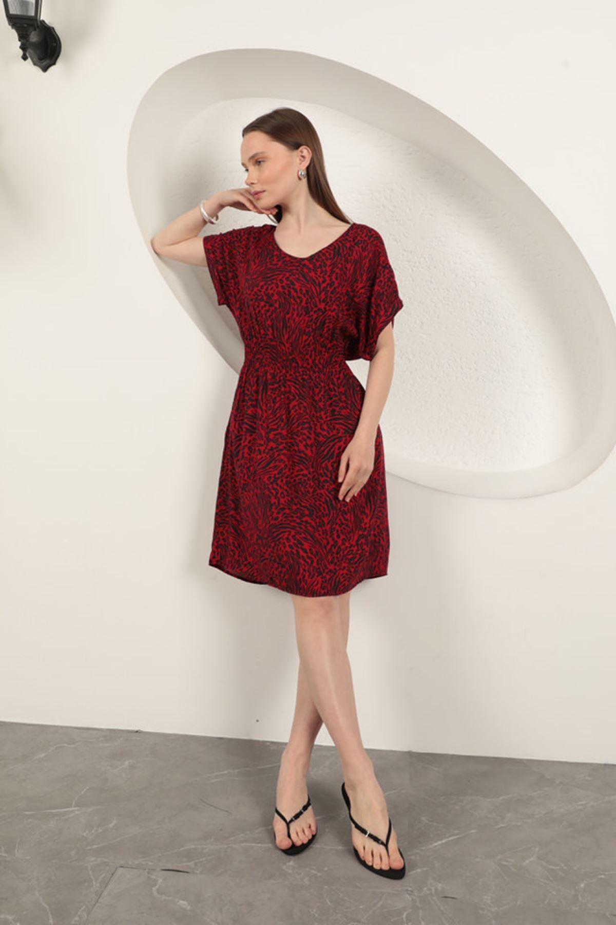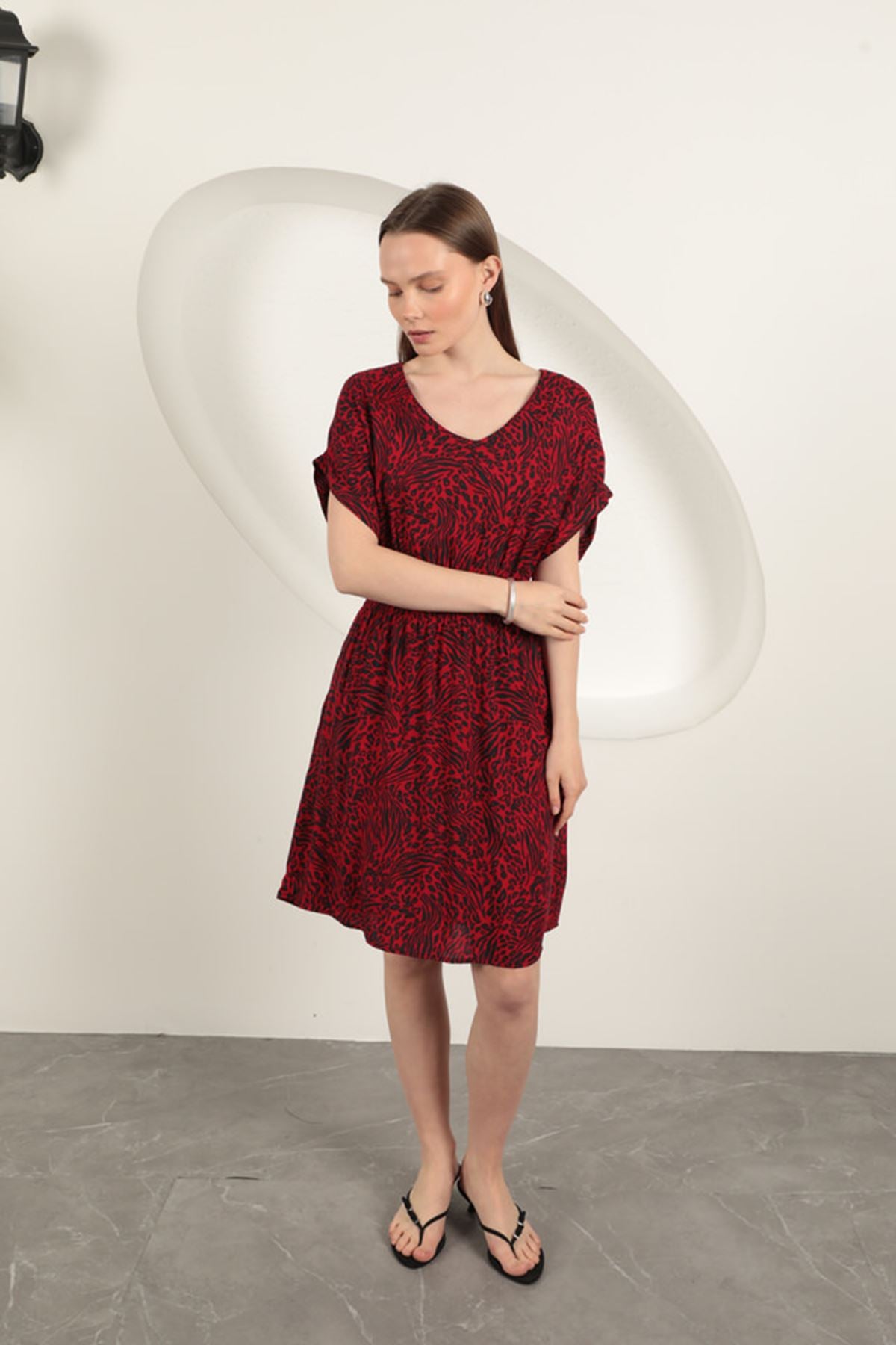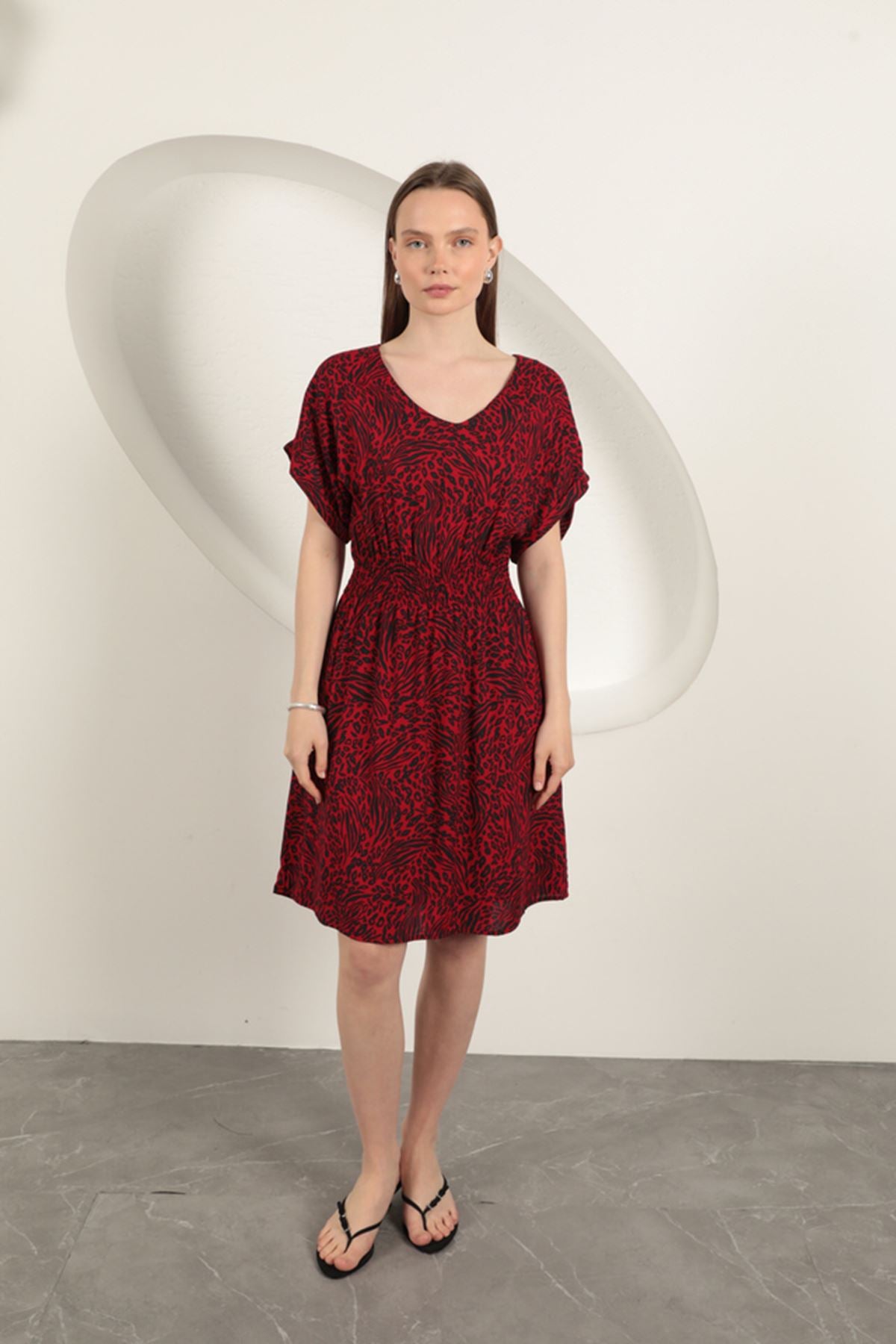 Viskon Kumaş Desenli Elbise-Kırmızı