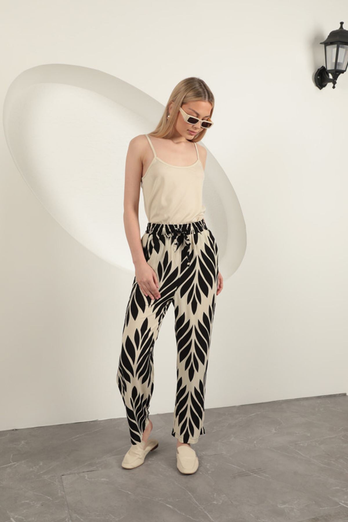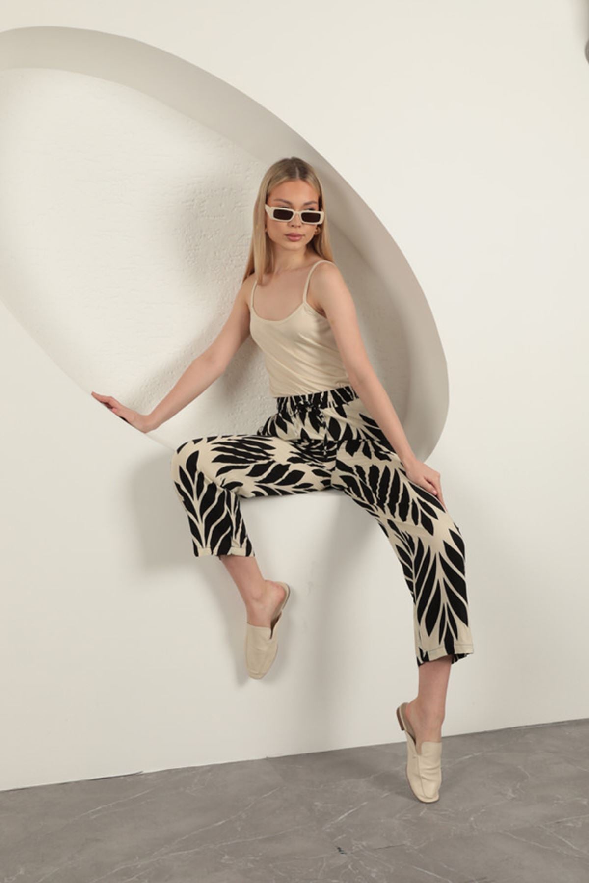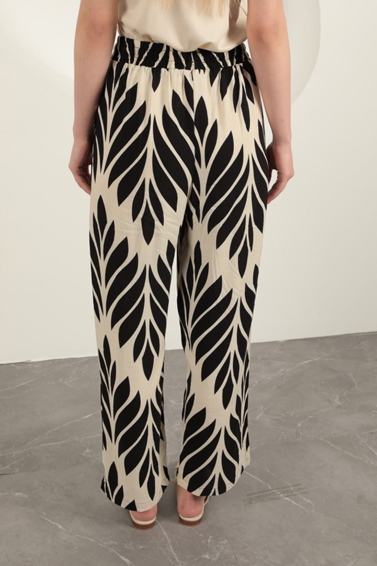 Viskon Kumaş Yaprak Desen Pantolon-Siyah